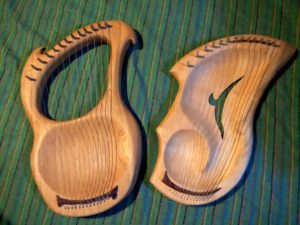 形は自由ですが、弦の張り方、音の響き、制作の難易度などに留意して決めてゆきます。基本的に穴開き型(写真左)とトレイ型(写真右)のものに分かれます。(箱形ボディの製作は現在ありません)