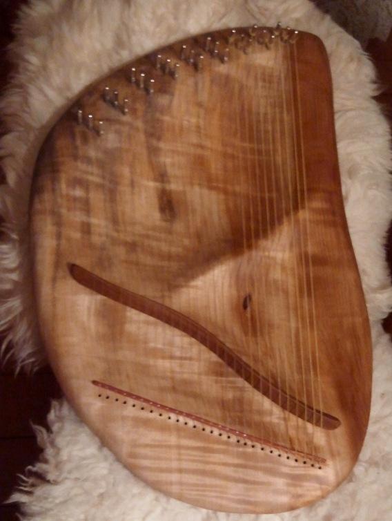 大型の演奏用ライアーの形などが元となっており、穴のこちら側(右手)と向こう側(左手)の双方(両面)から弦を弾くことができます。この場合、左手で弾くのはピアノの黒鍵部分と同じ、♯や♭音です。全音階希望の形はこちらとなります。